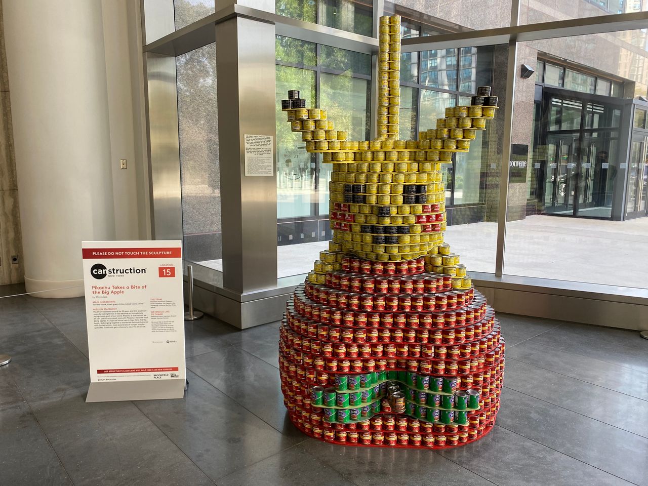 The sculpture is one of 16 that are part of Canstruction, a design and build competition that has returned to the Brookfield Place office, shopping and dining complex in Manhattan after going virtual last year due to the pandemic.